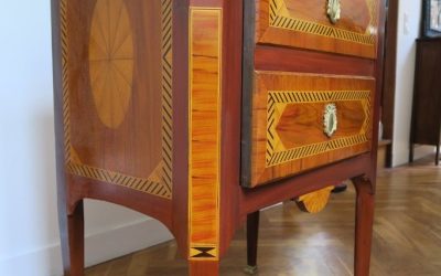 Restauration d’un meuble peint ancien très endommagé lors d’un transport : Dans un château classé monument historique de la région parisienne, restauration d’un coffre-fort exceptionnel imitant l’aspect d’une commode Louis XVI, dont la superbe marqueterie de bois…