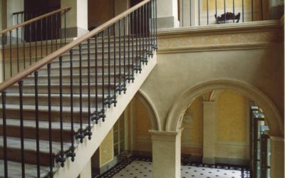 Dans un château classé de style Palladien, création et réalisation d’un décor de style Renaissance dans le grand hall, le grand escalier et la galerie à l’italienne : composition de panneautages en trompe l’œil, avec grandes ornementations sur les pilastres, 3 tons…