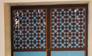 Restauration de trompe l’oeil dégradé par un dégât des eaux, dans un appartement parisien. Trompe l’oeil d’inspiration orientale à motif de moucharabieh, avec paysage de Sahara méditerranéen en arrière plan.