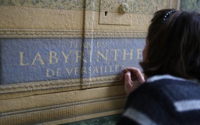 Décor mural en trompe l’œil du plan du Labyrinthe. Les patines, dessins, lettrages, et moulures ornementées ornant ce plan copié de l’original, qui s’inscrit dans le très beau trompe l’ œil en panoramique, projet de décor mural créé et peint par Christophe Rage sur un mur extérieur de la ville de Versailles.