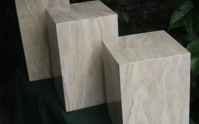 décor peint en faux marbre sur 3 soclesRéalisation en atelier d'imitation du marbre Galaxy, sorte de travertin de ton beige, pour des supports de plantes à poser sur le carrelage vert d'une maison contemporaine. L'imitation fait en sorte de représenter un bloc, en...