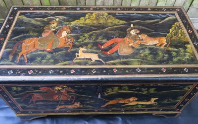Restauration d’un coffre du XVIIIe siècle. Sur les 5 faces d’un coffre aux décors ‘à l’indienne’ originaux et délicats, dont le couvercle était particulièrement fragilisé et endommagé. Il a été nécessaire de retoucher les fonds noirs ainsi que les motifs…