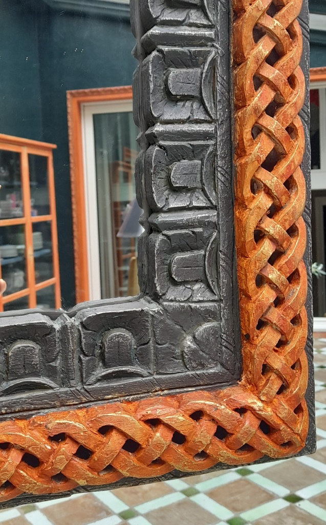 Dans un jardin d’hiver d’une maison de la région parisienne, suite à la modification des tons des murs, reprise du décor du cadre de miroir afin de l’intégrer à la nouvelle atmosphère, tenant compte des encadrements de portes, des meubles et peintures, tout en créant un élément précieux à forte valeur ajoutée.