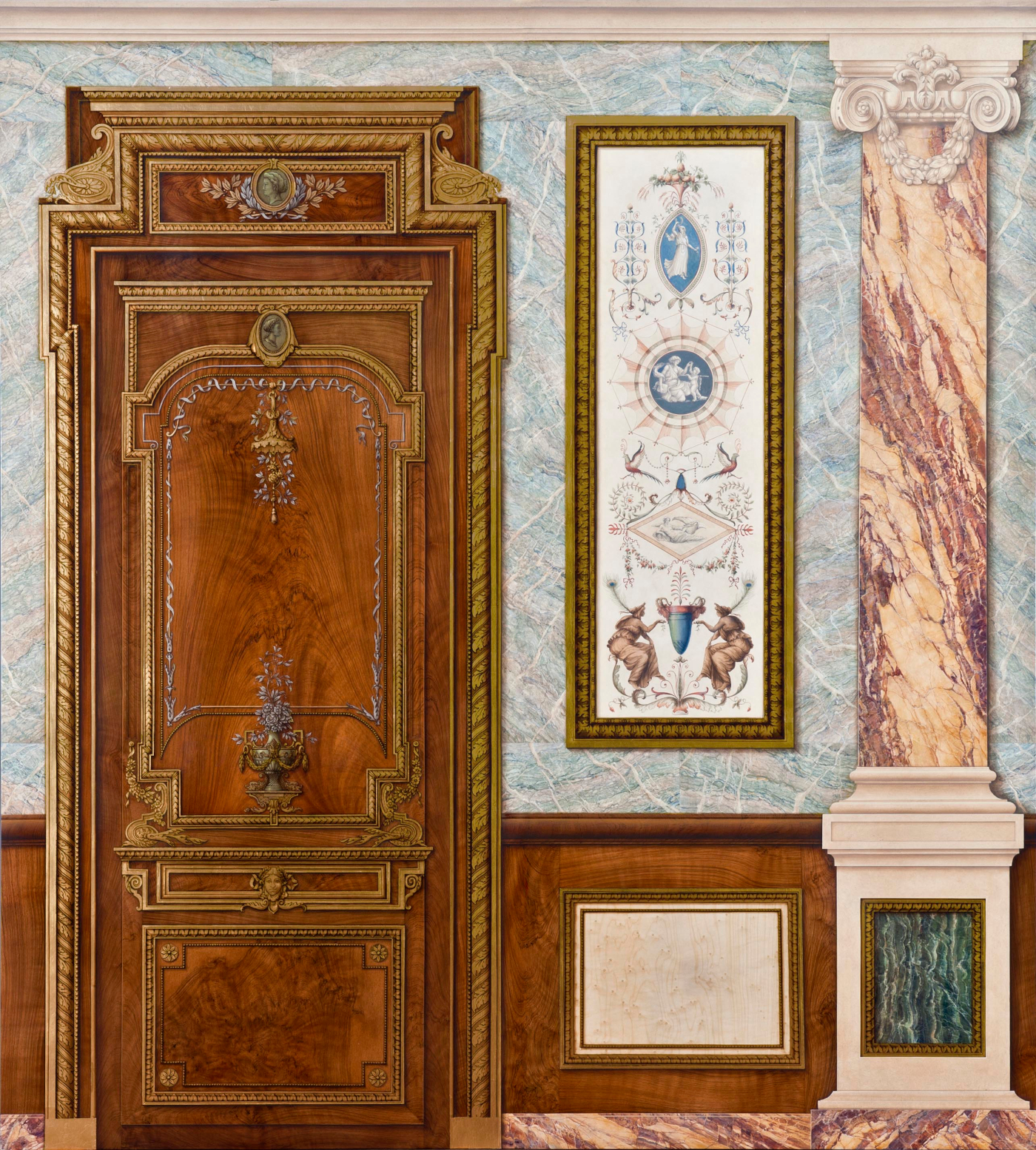 Il est composé d’imitations de noyer, de deux marbres, dont un bréché, d’une copie papier peint avec un motif en « Grotesque »  et de fausses moulures ornementées sur feuille de bronze.