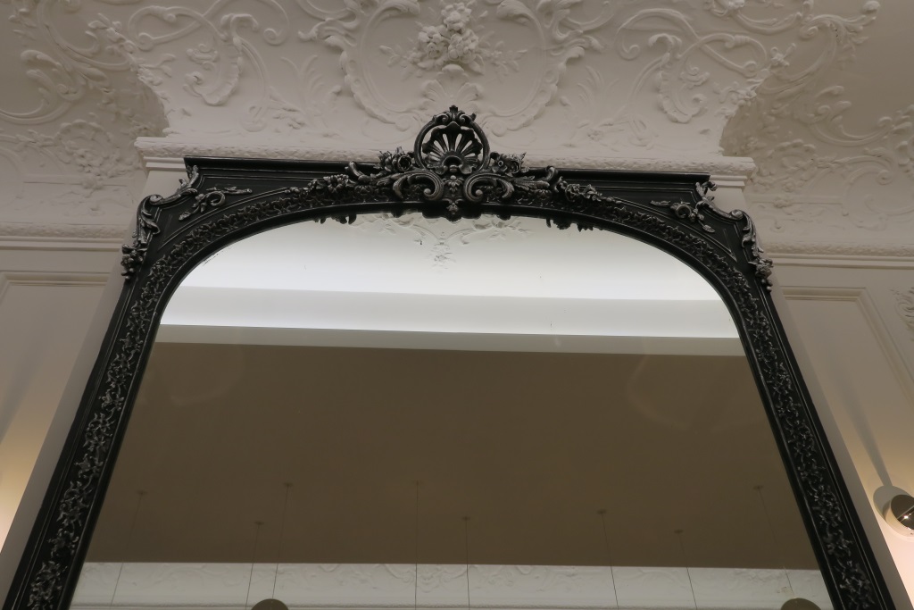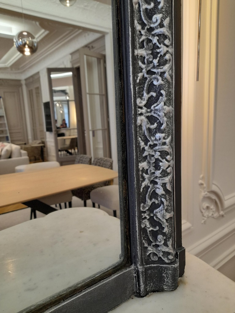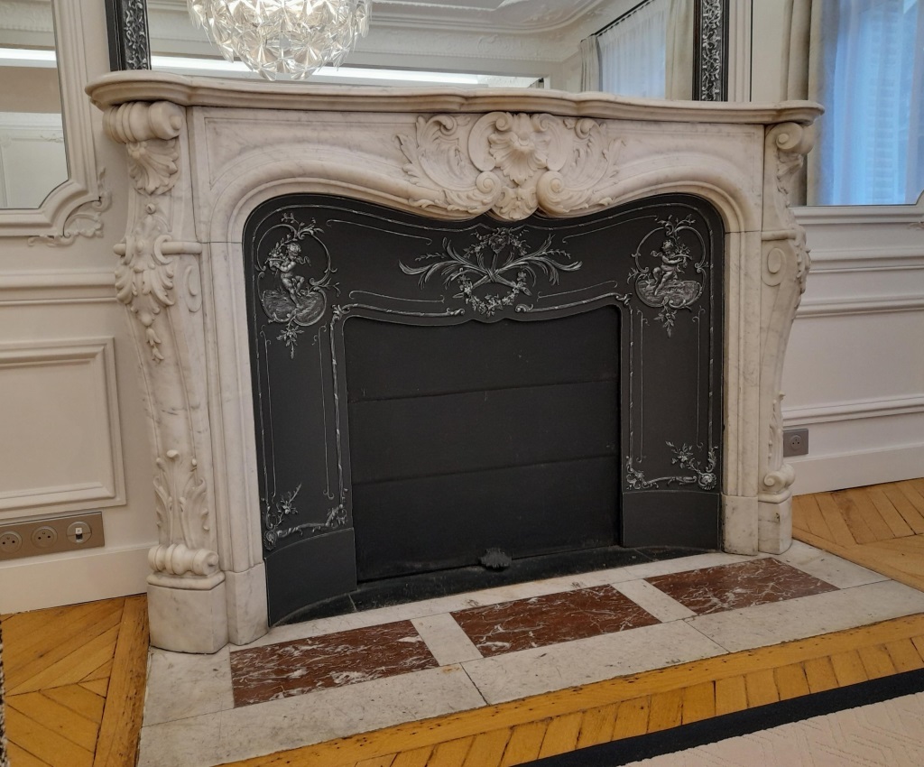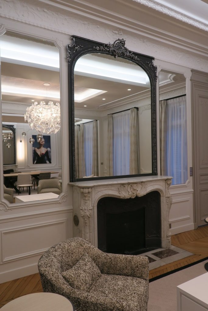 Décor peint argenté sur trois trumeaux et manteaux de cheminées dans les pièces de réception d’un appartement parisien haussmannien