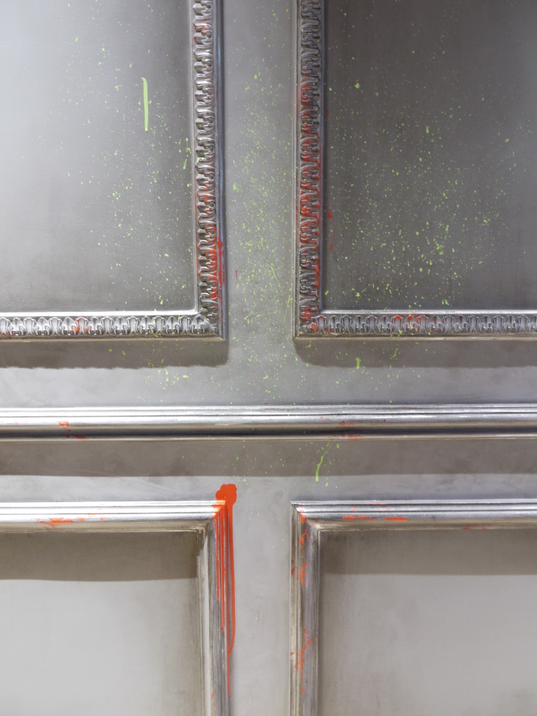 Sur les murs, décor composé de patine grise, avec rehauts d’argents sur les reliefs des moulures, de coulures rouge vif et spités verts anis.