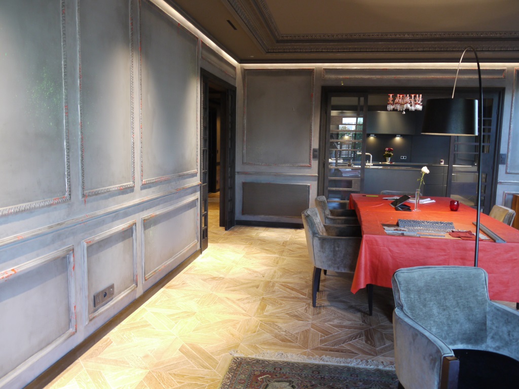 Décor peint de style baroque dans un salon parisien et la cuisine attenante