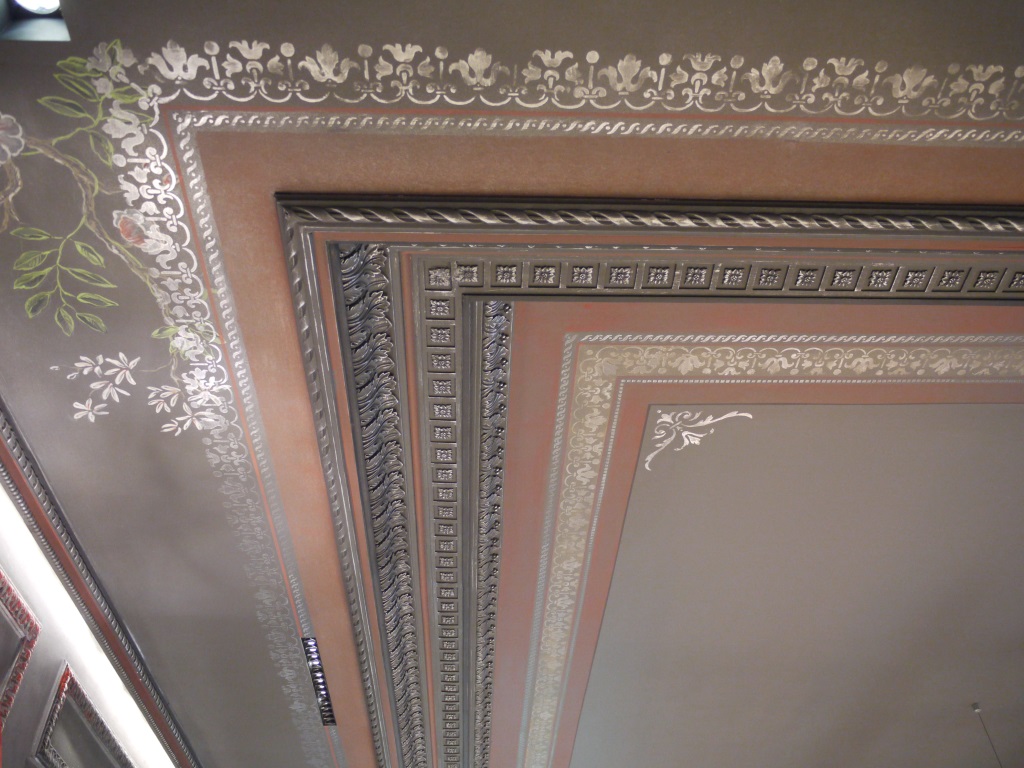 Sur les moulures des corniches, composition de rehauts argents sur les reliefs des moulures et filets ocre et anthracite, de motifs argentés au pochoir, et de patines.