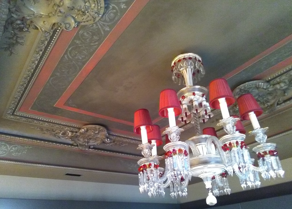 le décor peint est volontairement de style baroque : composition de rehauts argents sur les reliefs des moulures et filets ocre et anthracite, de motifs argentés au pochoir, et de patines.