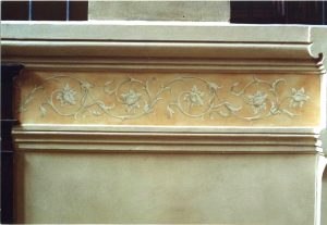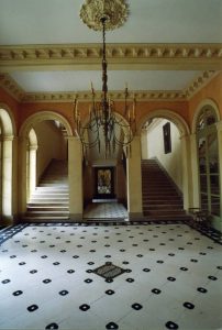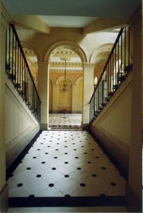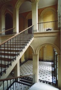Décor du grand hall, du grand escalier et de la galerie à l’italienne : composition de panneautages en trompe l’œil, avec grandes ornementations sur les pilastres, 3 tons de patines, filets, motifs et fausses moulures ornementées.