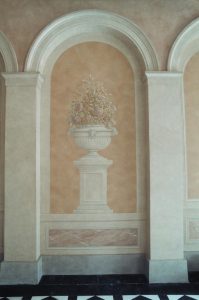 Les grandes arches face aux fenêtres sont décorées de fausses fenêtres en trompe l’œil, avec miroir pour refléter la lumière. Celles face à l’escalier, de panneautages ornementés, avec vasque fleurie sur socle. d’ornements ou de faux marbre en soubassement.