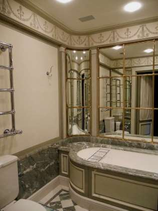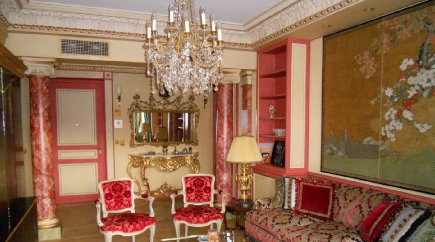 Dans le salon d’un appartement monégasque, décor de style Néoclassique, composé de faux marbres sur les colonnes, de patines en panneautages de ton paille et rouge, avec filets dorés, sur les boiseries, les murs et les corniches.