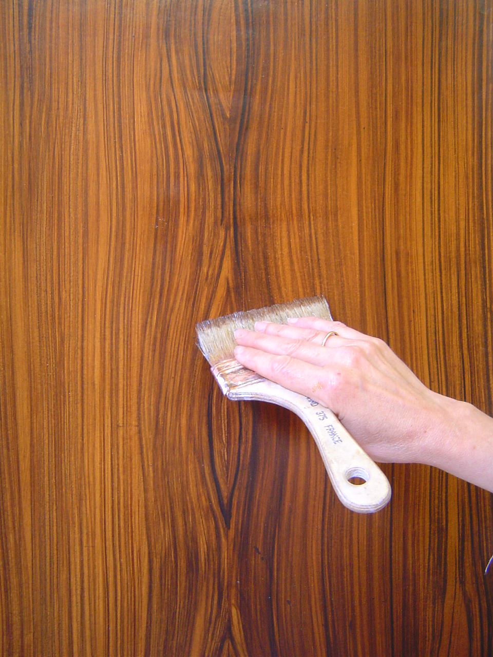 A l’aide d’une brosse à glacer, glacer l’ensemble du ton brun noir transparent et léger, afin d’unifier le ton des planches. Égaliser au spalter jusqu’à faire disparaitre les traits de pinceaux, dans le sens du fil du bois.