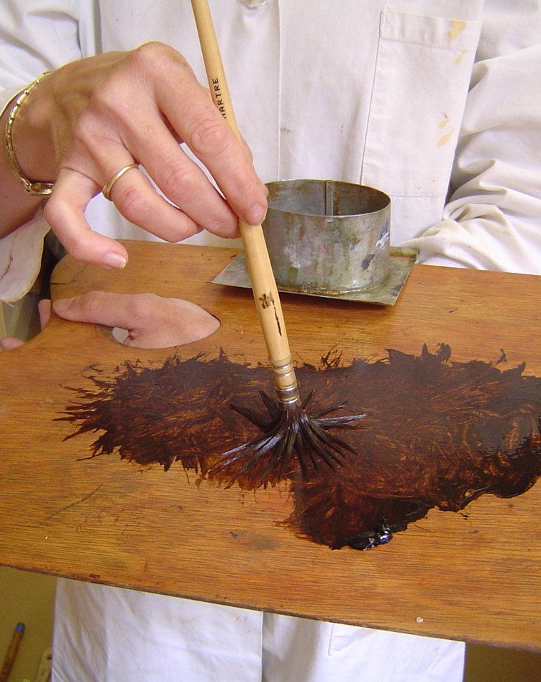 Mélanger au glacis à l’huile, de la terre d’ombre brûlée et un peu de noir, afin de faire un glacis opaque d’un ton brun noir très foncé.