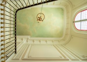 Ce ciel peint est réalisé en collaboration avec Christophe Rage, d’inspiration Art Nouveau aux tons bleus-verts, pour restituer l’atmosphère de l’époque.