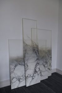 Faux marbre Brèche Grise sur plaques de plexiglas s’estompant dans la transparence