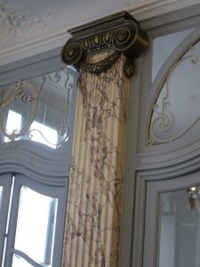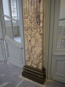 Imitation marbre dans une salle de réunion, pour mettre en valeur les grands pilastres cannelés d’un portique exceptionnel datant du XIXe siècle