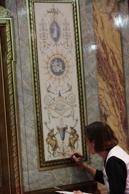 ** Pour ce qui est des décors parisiens j’ai été appelée par trois fois à la restauration de plafonds Néogothiques, mais aussi à des décors Néoclassiques, Charles X ou Art Nouveau.