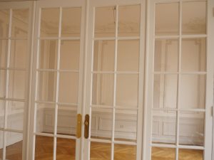 Dans un appartement parisien du XIXe siècle rénové par une architecte, mise en valeur des motifs en bas relief des gorges des corniches en staff du salon et de la salle à manger attenante par des rehauts de léger gris et inversement sur les motifs de tous les dessus de porte, par des rehauts de blanc.