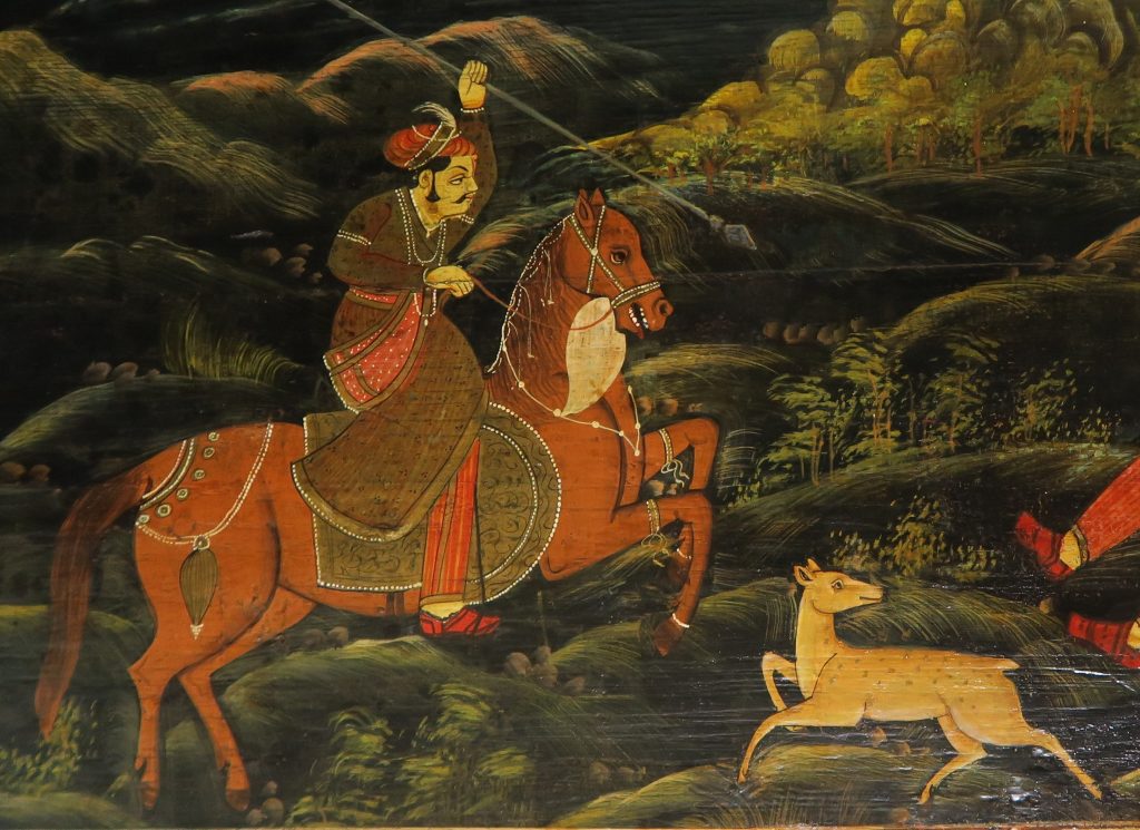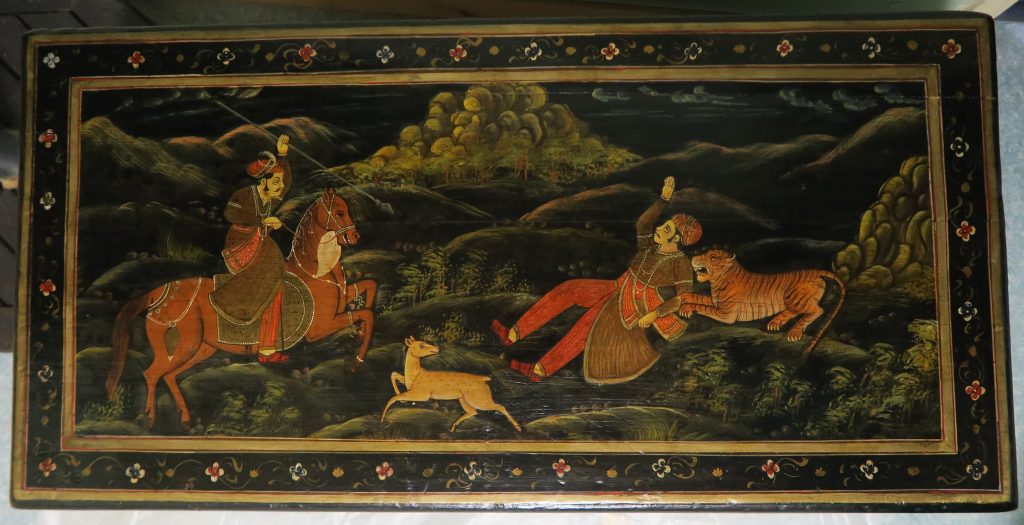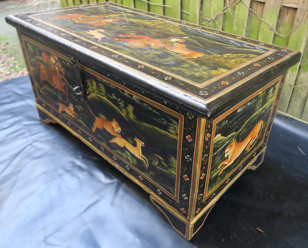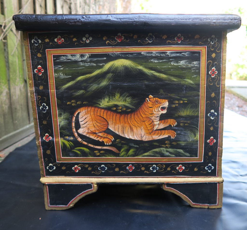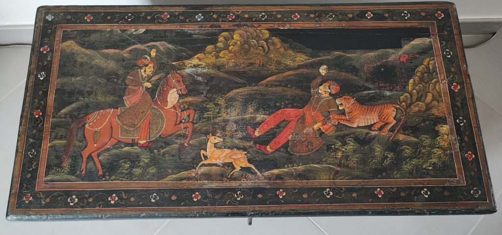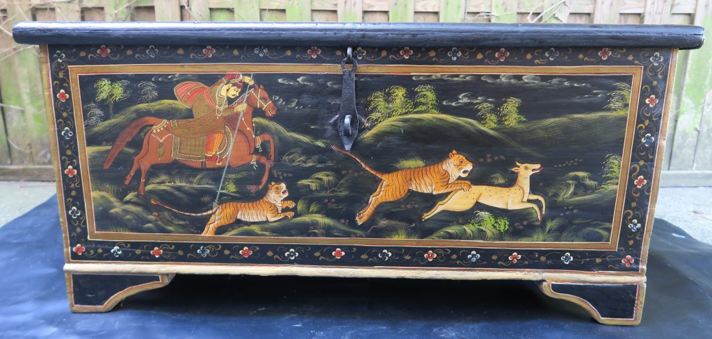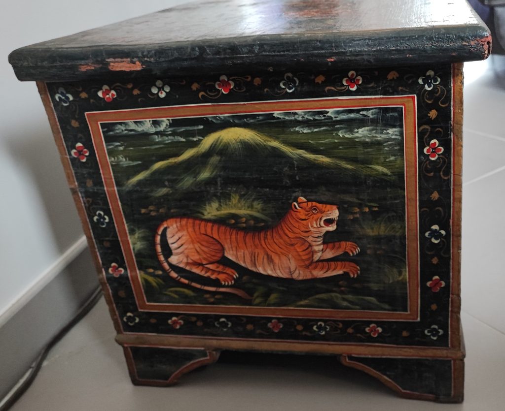 Restauration des 5 faces d’un coffre aux décors ‘à l’indienne’ originaux et délicats, dont le couvercle était particulièrement fragilisé et endommagé. Il a été nécessaire de retoucher les fonds noirs ainsi que les motifs exotiques à l’indienne, en ocre jaune et rouge, verts, mais aussi certains filets dorés, rouge et blanc, puis de le vernir pour lui offrir une meilleure protection.
