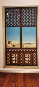 Trompe l’œil d’inspiration orientale à motif de moucharabieh, avec paysage de Sahara méditerranéen en arrière plan.