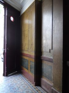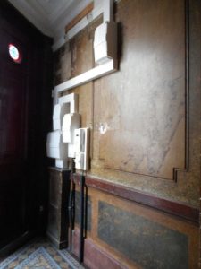 Sur l’armoire technique d’un vestibule Haussmannien, restitution d’un décor de stuc marbre -hélas, dégradé- qui orne ses murs.